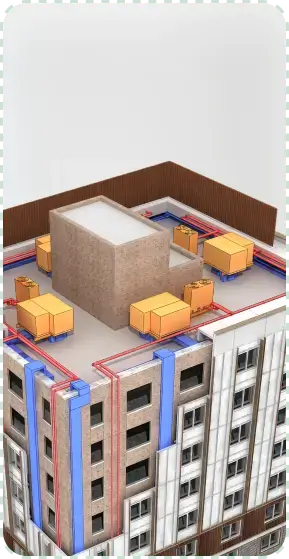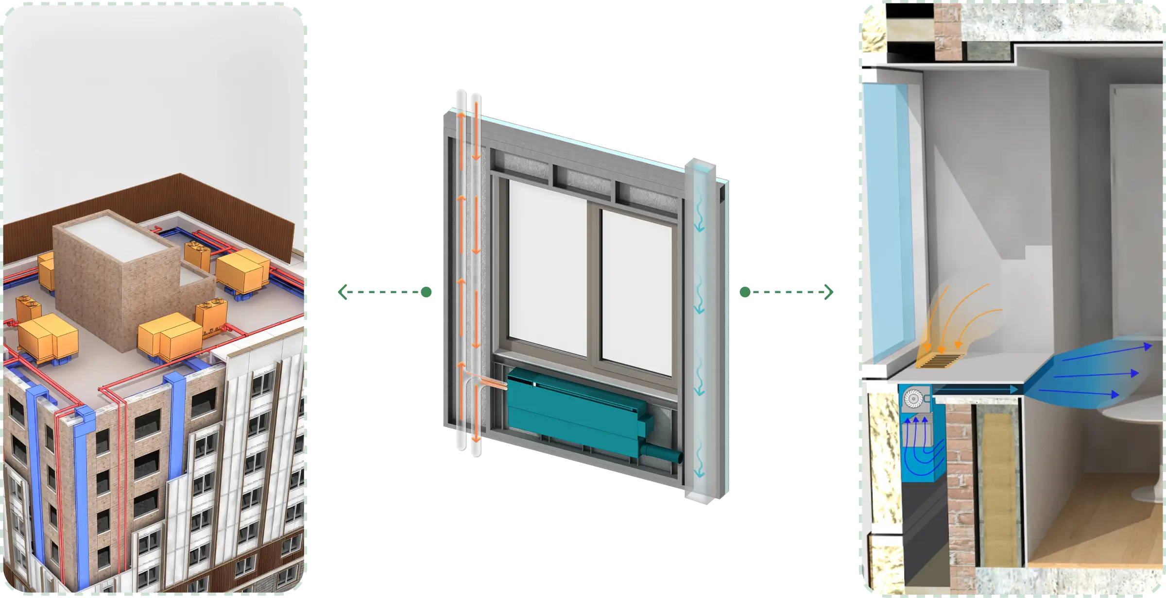 HydroShell Integrates high performance central heating, cooling and ventilation into insulated overcalled facade panels, delivering year-round thermal comfort and indoor air quality, deep energy savings, and a refreshed facade.
